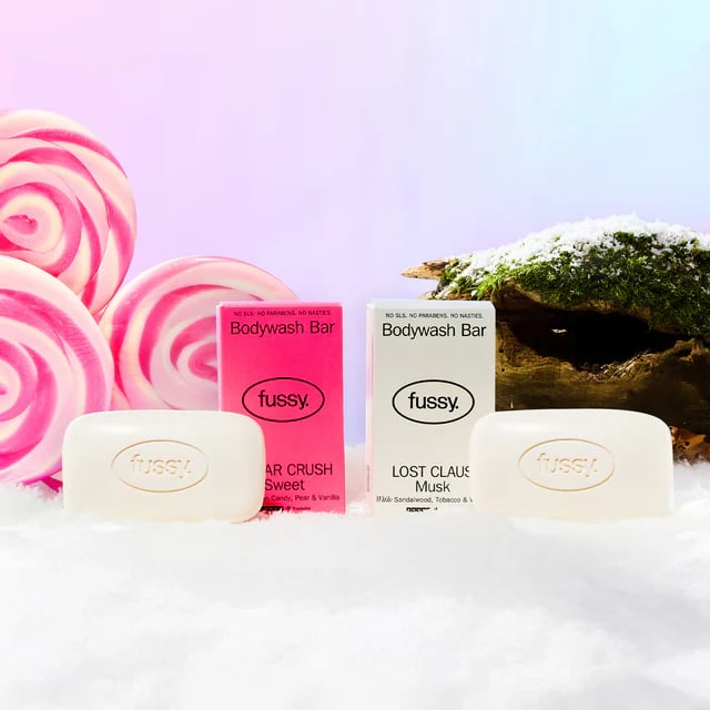 Fussy's range includes solid body bars, an alternative to liquid body wash, which are formulated with natural ingredients. These bars are designed for cleansing and are another step towards a plastic-free bathroom, offering a simple and effective personal care option.